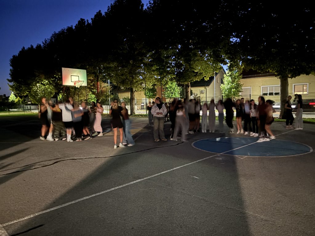 Zadnji večer v Prekmurju smo imeli party zunaj na igrišču. Še sreča, da nam je bilo tudi vreme naklonjeno. Učitelja Andrej in Alenka sta pripravila velik zvočnik in zabava se je pričela. Noreli in plesali smo… a vsega lepega je enkrat konec. Poslovili smo se od njiju in naše učiteljice so nam dovolile, da se , preden gremo na nočni počitek, lahko podružimo še v »bunkerju«. V vsakem nadstropju je bil večji prostor z veliko sedežno , stoli in mizo za druženje – bunker. Potem pa tuširanje, pakiranje in lahko noč.