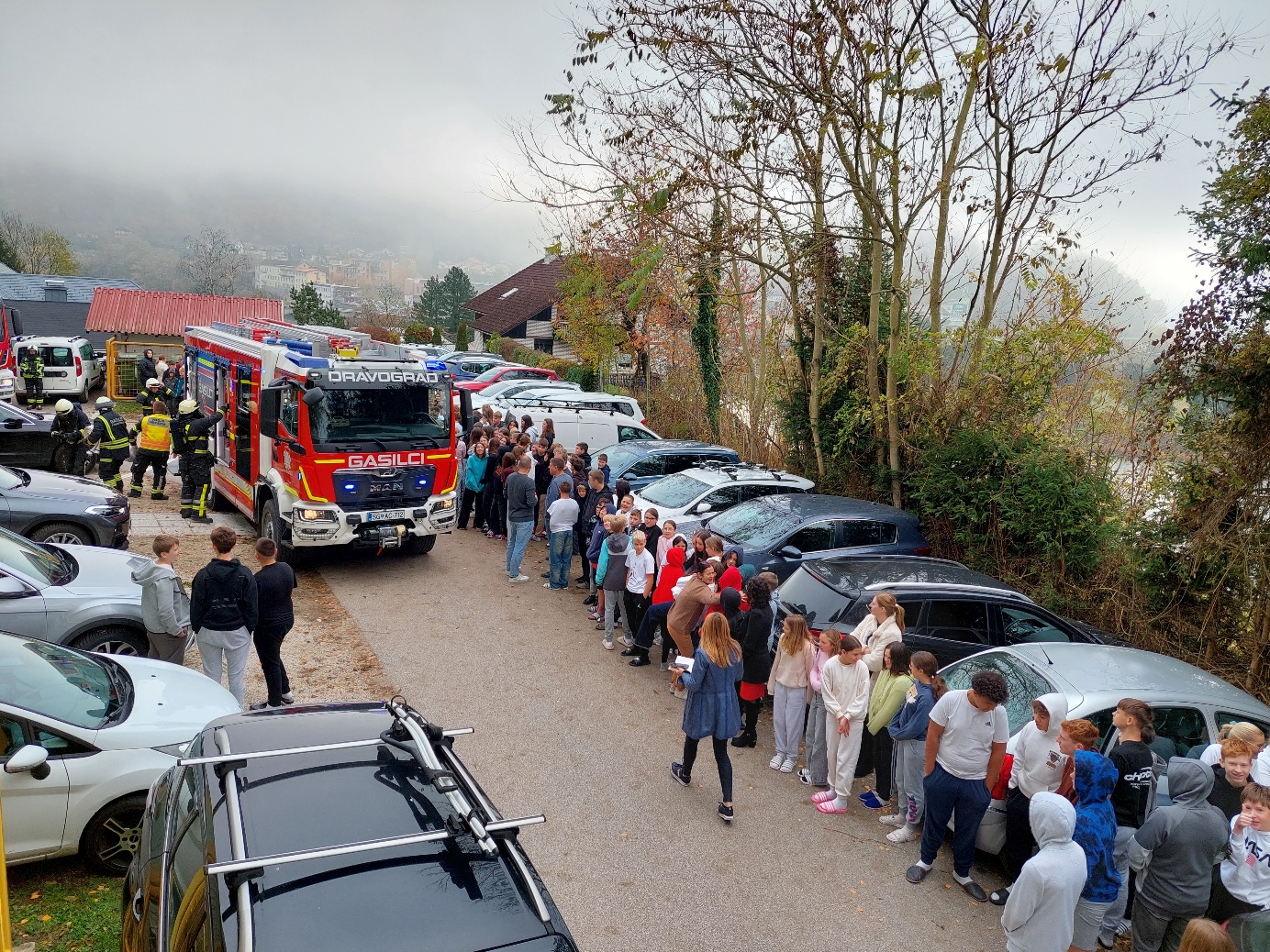 Mesec oktober je mesec požarne varnosti, zato smo imeli v sredo, 5. 11. 2025, nenapovedano evakuacijsko vajo. 1. uro smo vsi odšli k pouku, 15 minut pred koncem ure pa je zazvonil alarm za evakuacijo. Čim bolj mirno smo vstali iz šolskih klopi in se postavili v vrsto. Iz vsakega nadstropja (kjer smo imeli pouk) smo počasi odšli do najbližjega evakuacijskega izhoda in na zbirno mesto za šolo. Nekateri smo morali tudi po požarnih stopnicah. Počakati smo morali, da so gasilci potrdili, da je »požar pogašen in smo se vsi varno rešili«. Ko so nas prešteli in se je oglasila sirena za konec nevarnosti, smo se vrnili v razrede. Tako je potekala naša evakuacija ob mesecu požarne varnosti.