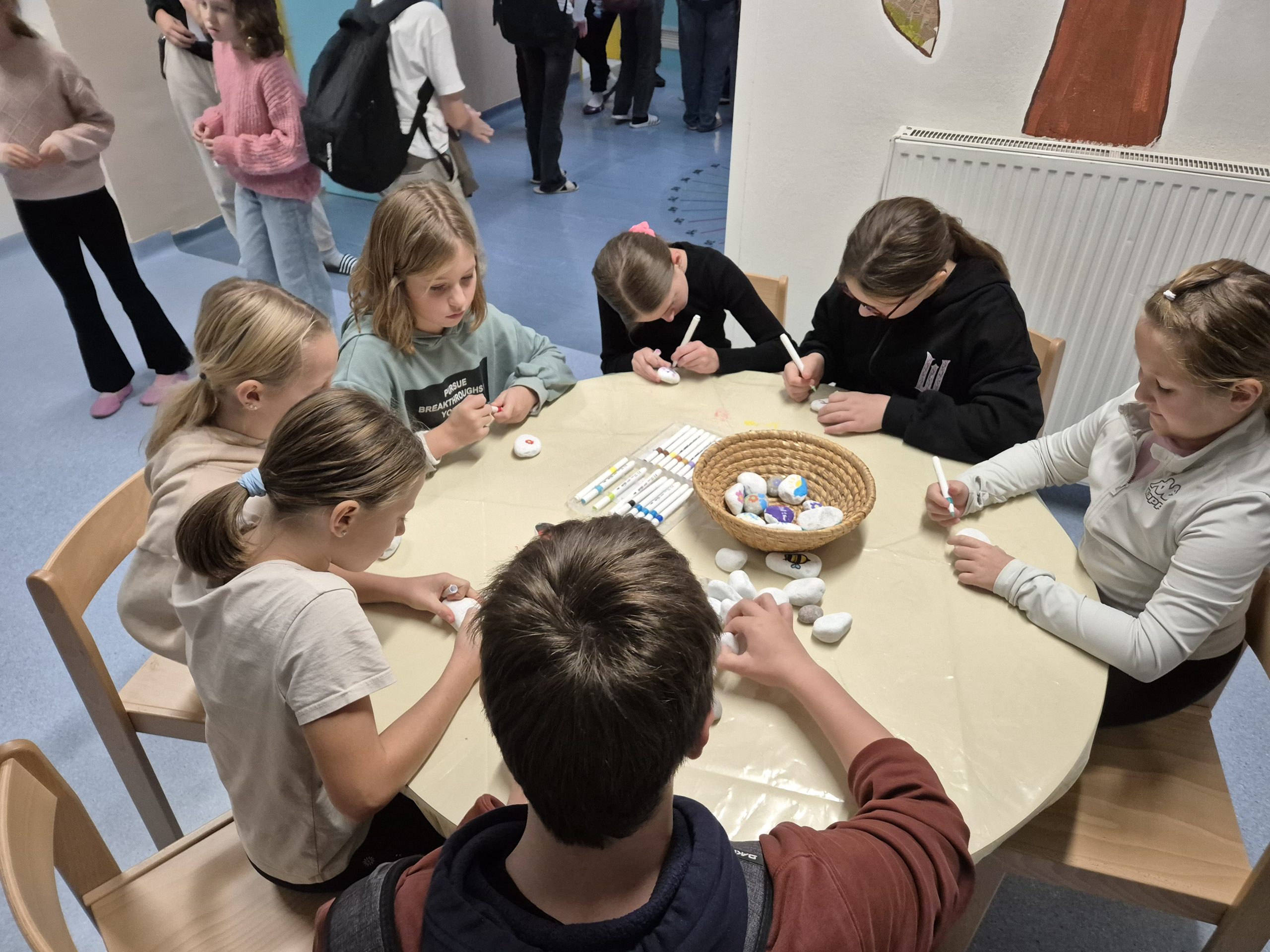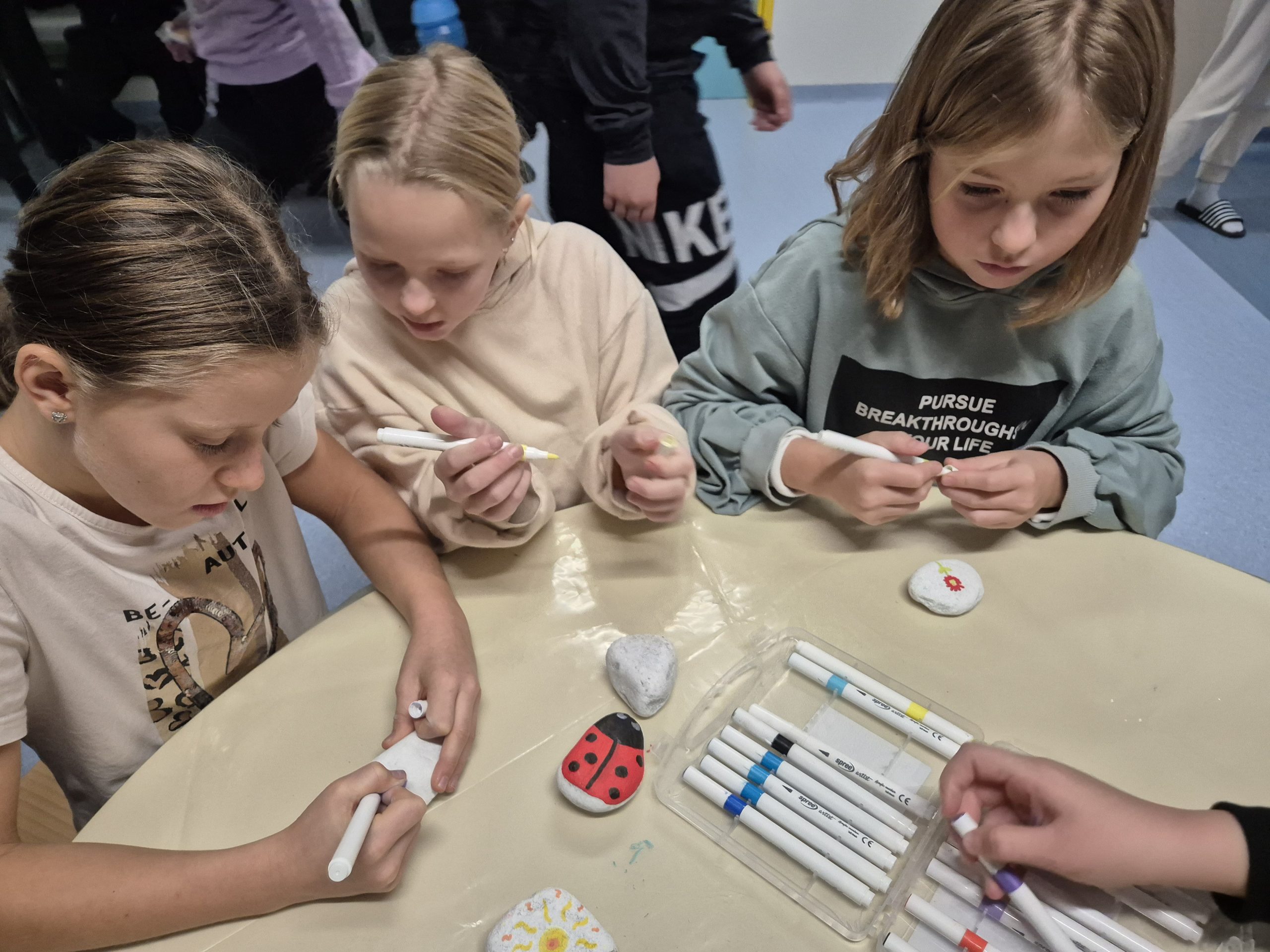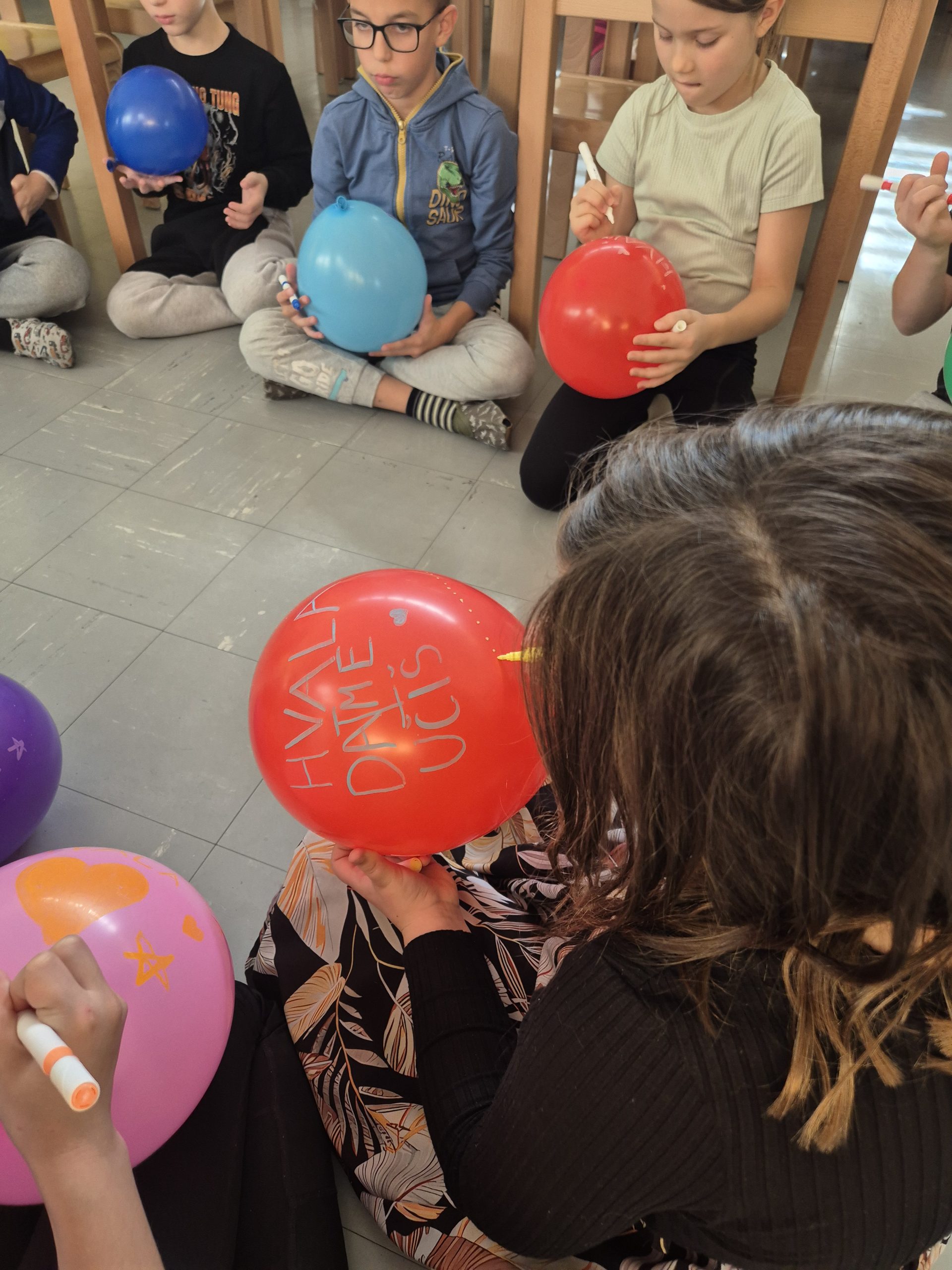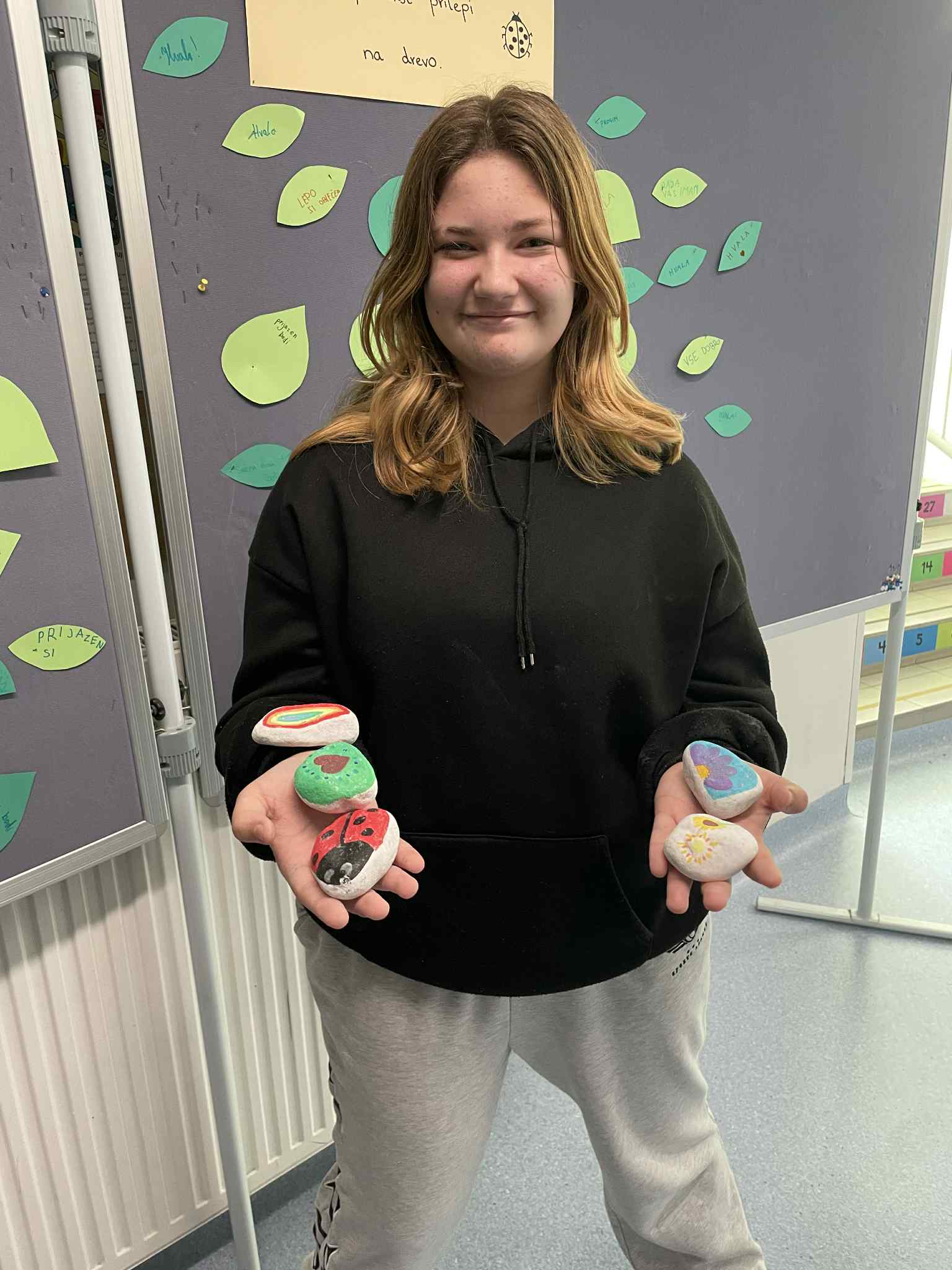 A zanje dan ni bil čisto brez skrbi. Njihove aktivnosti so se pričele že zjutraj s pripravo panojev in miz za delavnice, sledila je skrivalna akcija, saj so morale v prostorih šole skriti več kot 60 kamenčkov prijaznosti, ki so jih ustvarile v času priprav na ta dan. Učenci so jih vznemirjeni iskali in tisti, ki so jih našli, so jih z veseljem stiskali v dlaneh, pokazali ali pa podarili drugim. Nato so učenke v kratki objavi po šolskem radiu predstavile pomen prijaznosti in načine, kako jo lahko izkažemo drug drugemu. V 1. nadstropju so sledile ustvarjalne delavnice za učence 2. in 3. triade, kjer je zraslo prijazno drevo, bogato z listki lepih in prijaznih besed in misli, hkrati so nastajali pisani kamenčki prijaznosti, med katerimi ni bilo takšnega, ki bi širil nestrpnost ali negativizem. Učenke so obiskale tudi učence 1. triade. Skupaj so poslušali pravljico z naslovom Oprosti, se pogovarjali o prijaznih dejanjih, risali, peli, plesali in ob koncu skupnega srečanja napihnili svoj prijazen balonček ter ga okrasili s toplo besedo ali sliko.