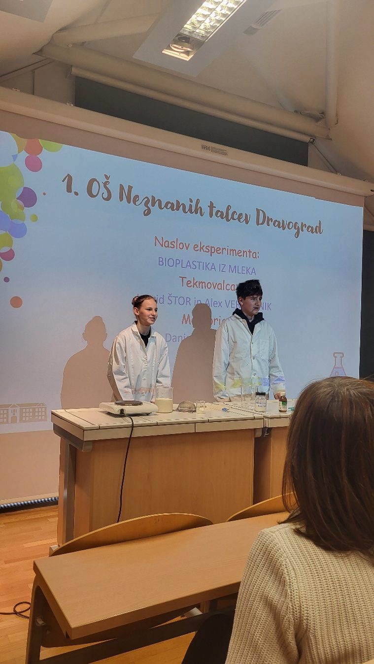 Naša šola je tudi letos sodelovala na tekmovanju iz kemijskih poskusov. Obe prijavljeni ekipi sta se uvrstili na državno tekmovanje, ki je potekalo 11. decembra v Ljubljani, na Gimnaziji Moste. Letošnja tema je bila trajnostni način eksperimentiranja v kulinariki in visoki gastronomiji.