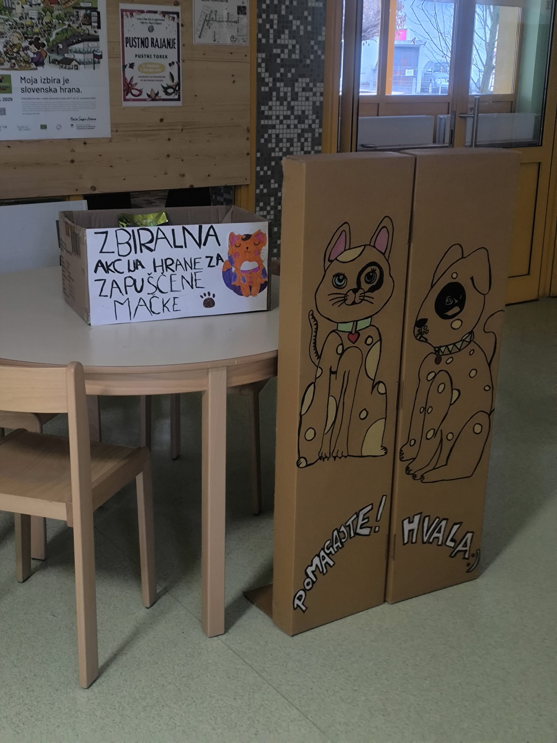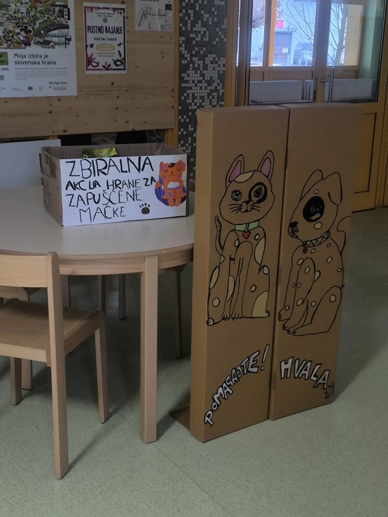 Da bi mačkam olajšali življenje na prostem, smo z učenci izdelali stirodur hiške za mačke. Hiške smo pobarvali, jih napolnili s slamo in postavili na suha in varna mesta v njihovem okolju. V šoli smo organizirali tudi zbiranje hrane za mačke, ki smo jo predali prostovoljcem, ki zanje skrbijo.